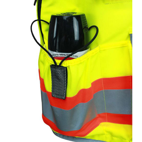 Pockets: Front flap covered radio pocket, flap covered split radio pocket, lower front cargo pockets with flagging tape grommets, 2 water bottle/paint can pockets, 2 large two layer inside open pockets