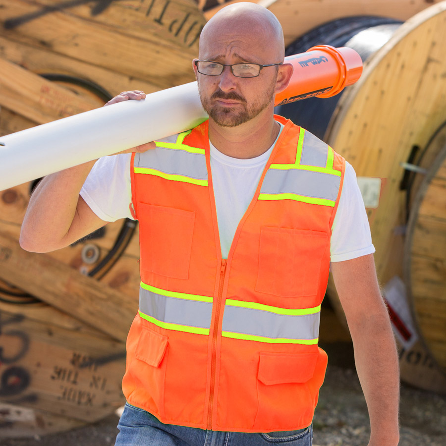 Our Safety Multifunction Vest is part of our Hi Vis Safety Economy Vest line and is ANSI II Compliant and designed with 6 pockets and additional features with surveyors in mind. The vest is light, comfortable 3.1 ounce mesh fabric with reinforcing black trim and a zipper front closure. This vest has a total of 6 pockets and a D-ring pass-through for fall arrest gear.