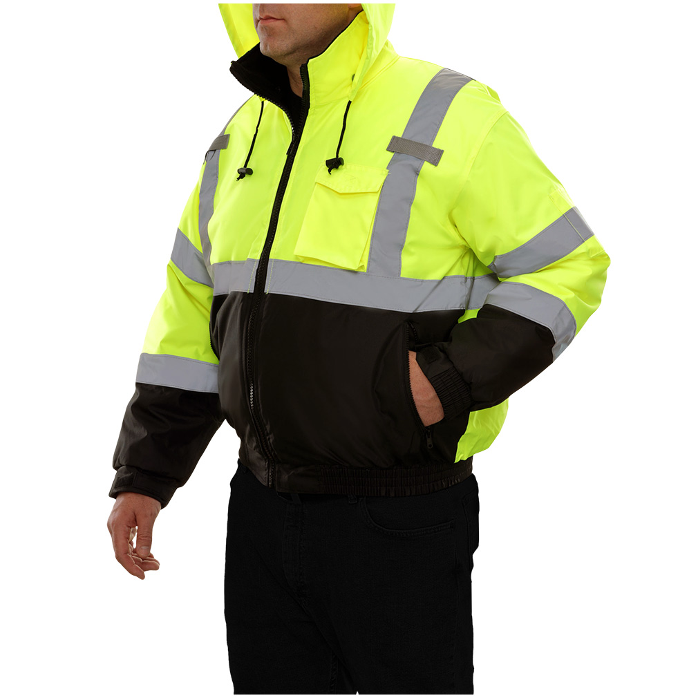 This Hi Vis Safety Jacket is an ANSI Class 3 compliant High Visibility Bomber Jacket. It is made with a waterproof shell of 300 denier woven polyester and a quilted padded tafeta liner.