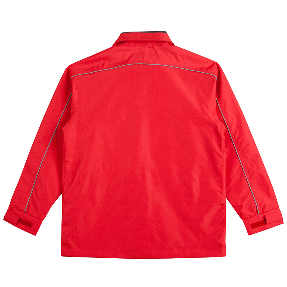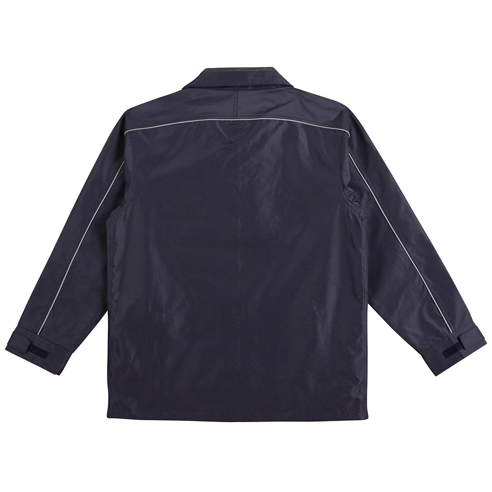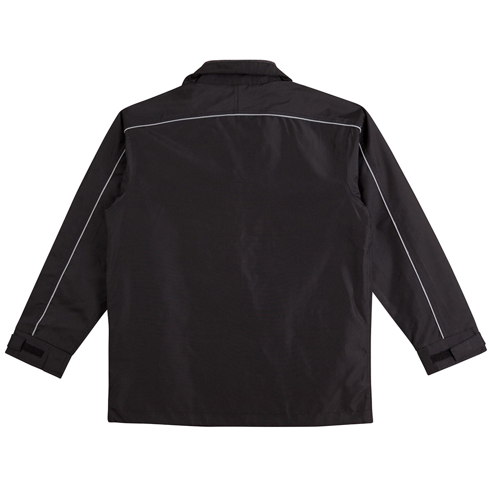 Water repellent Oxford shell jacket with silver reflective piping, charcoal colour fleece lined collar, inside mesh lining. Double front & inside pockets. Hidden draw cord at the hem of jacket Hidden mobile phone pocket in front. Inside back lining can be opened for easy access to chest & back embroidery. Adjustable velcro cuffs