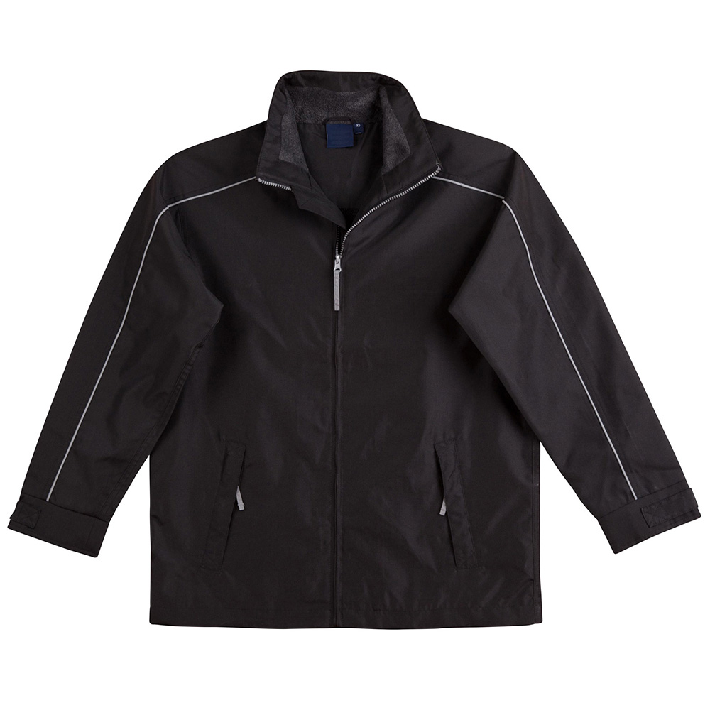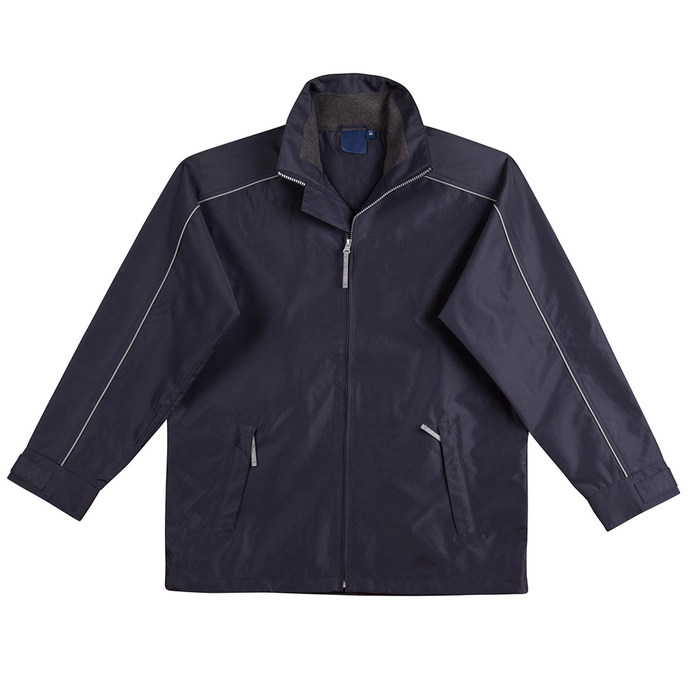 Water repellent Oxford shell jacket with silver reflective piping, charcoal colour fleece lined collar, inside mesh lining.